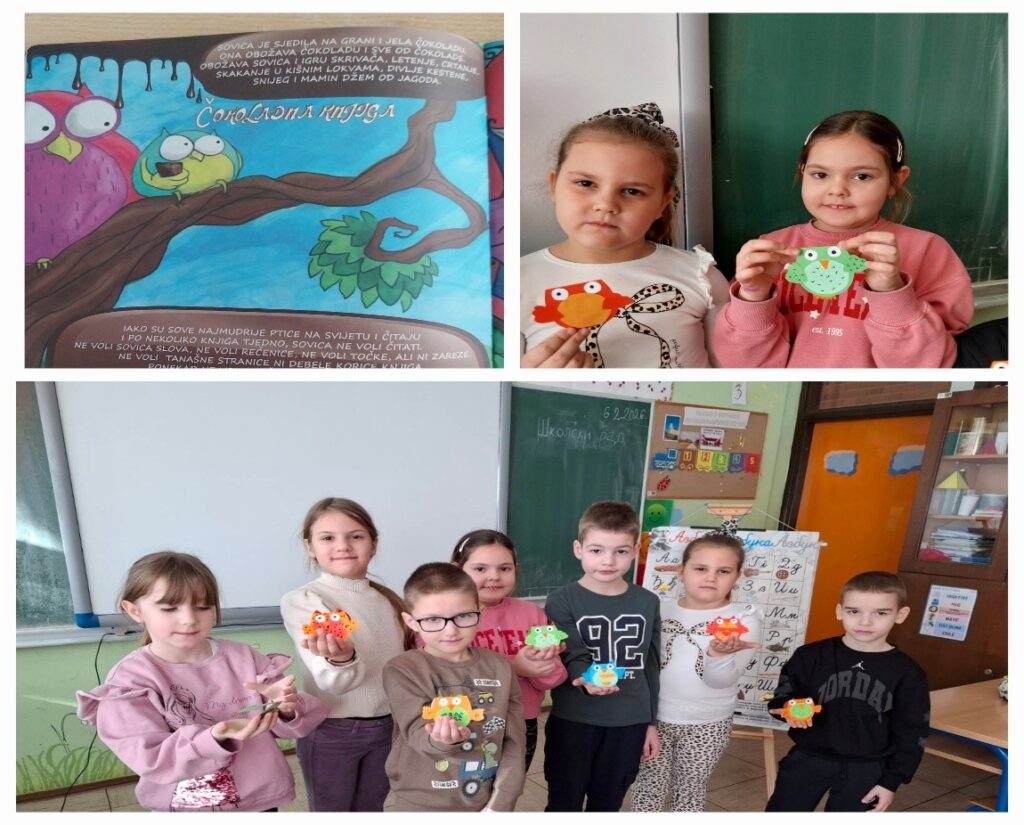 Učenici 1. razreda su na satu srpskog jezika čitali slikovnicu „Čokoladna knjiga“, izrađivali su mudre sovice – straničnike za knjige i pisali poruke o važnosti čitanja.