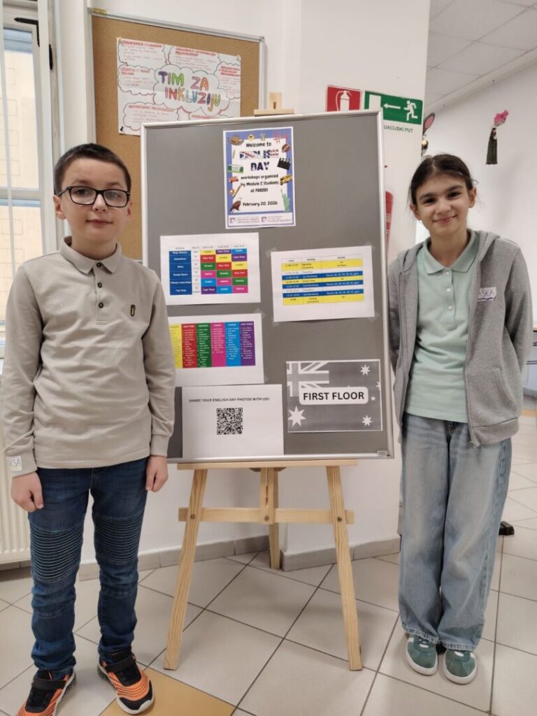 20. veljače 2026. godine, učenici 4. razreda, Saška Čalić i Aleksa Popović, sudjelovali su u pratnji učiteljice engleskog jezika Nikoline Jelečević, u kreativnim radionicama na engleskom jeziku pod nazivom English Day na Fakultetu za odgojne i obrazovne znanosti u Osijeku.